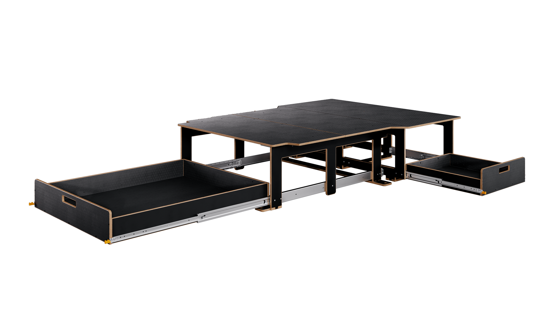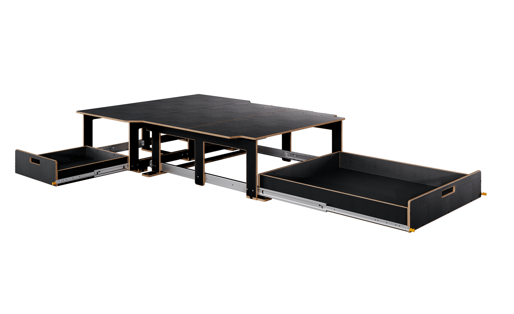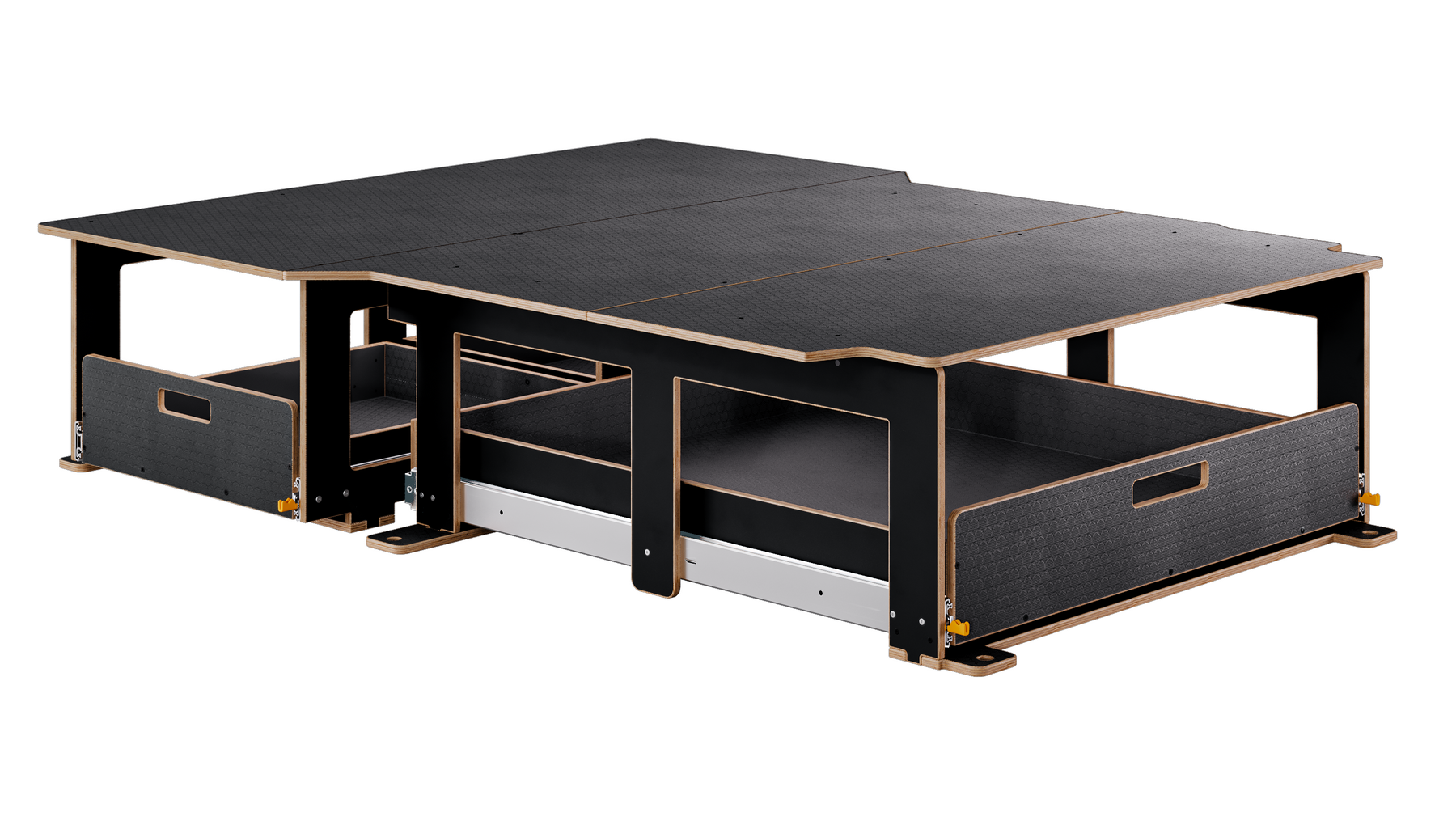 It combines a two-drawer unit behind the bulkhead with a single-drawer unit at the rear, creating a flat, continuous platform the full length of the van — ideal for carrying sheet materials, ladders, or bulky items on top.