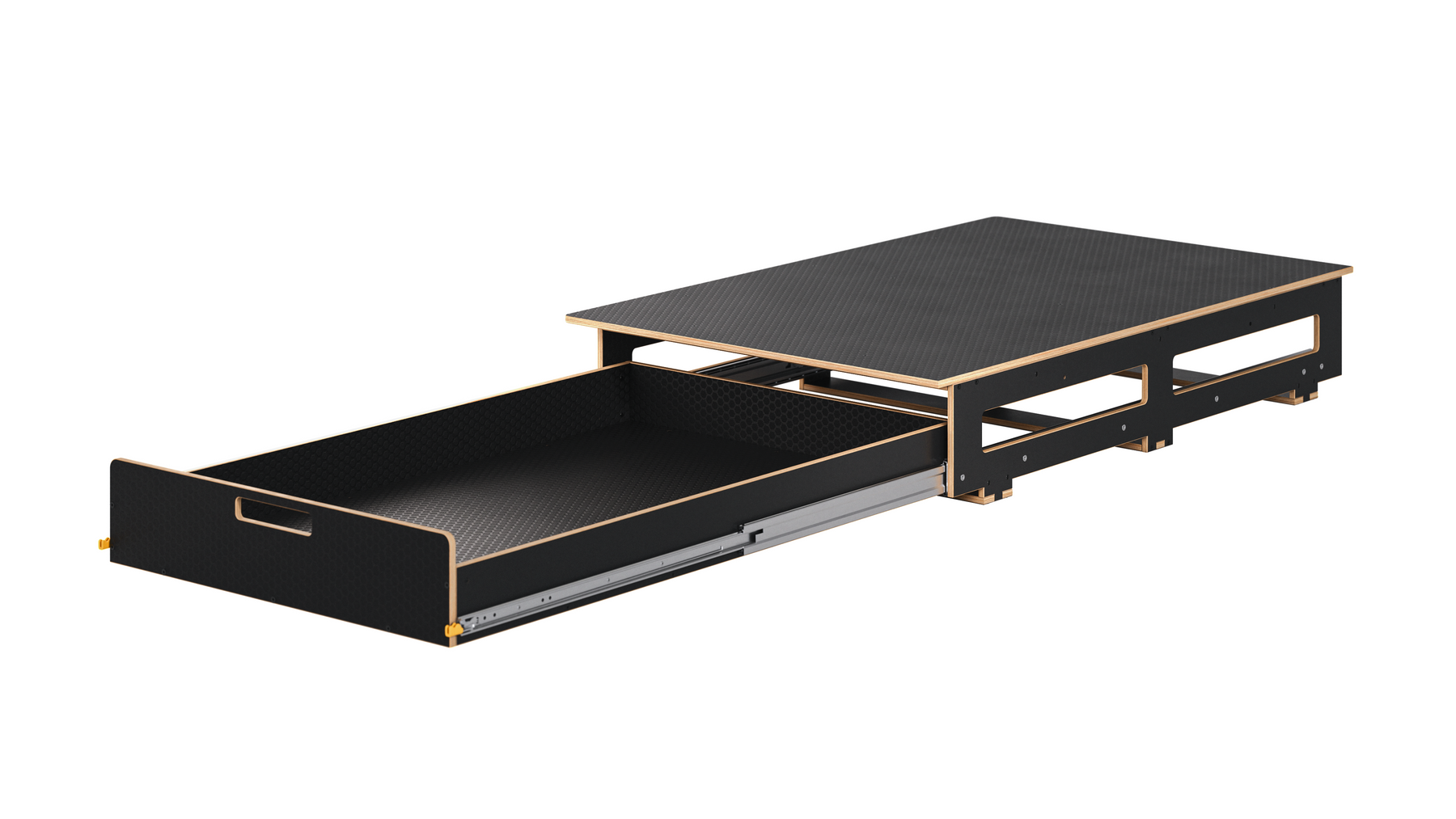This unit fits behind the bulkhead, with a large smooth-sliding drawer that opens from the side loading door — keeping the back of your van free for larger gear.