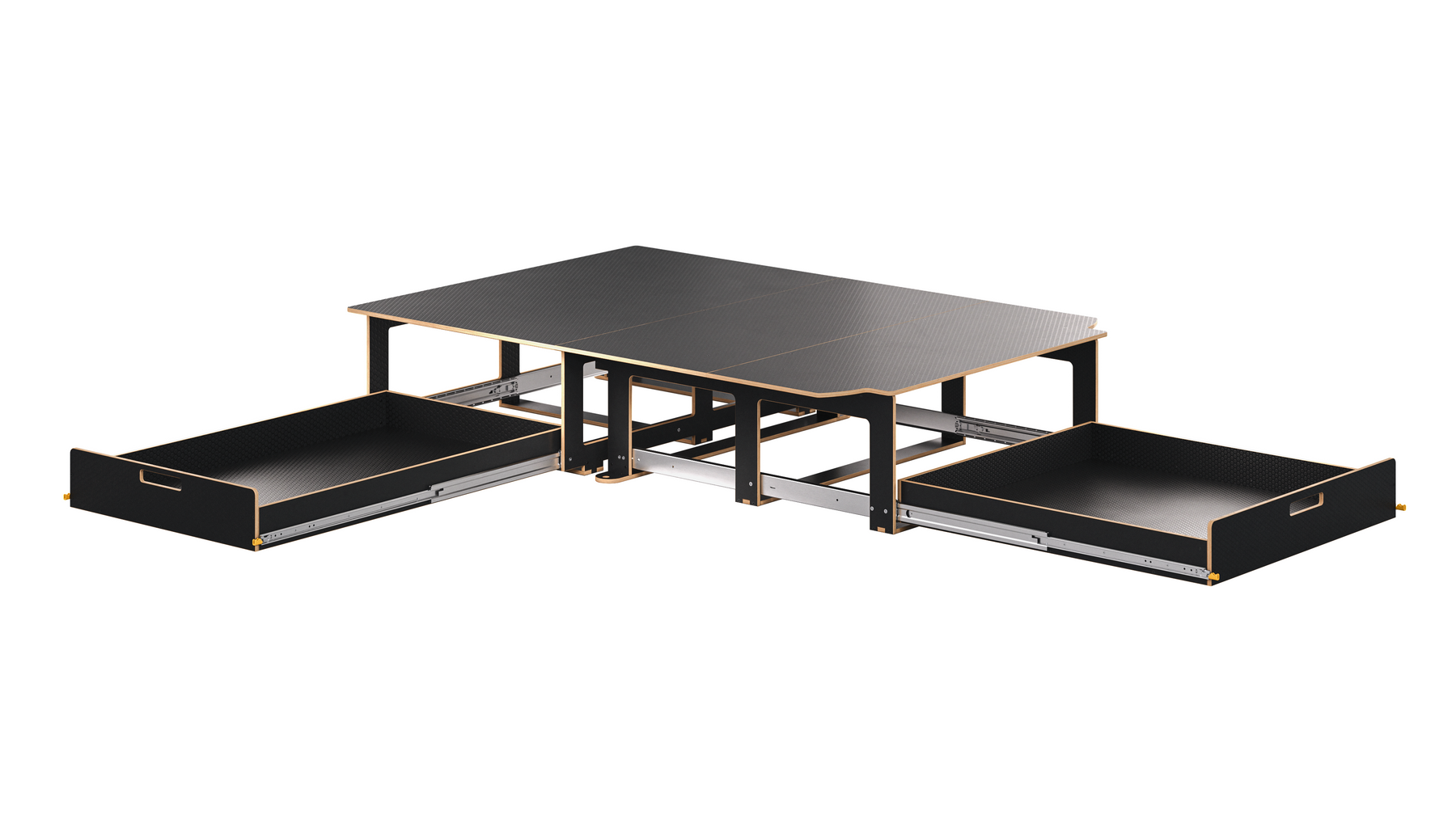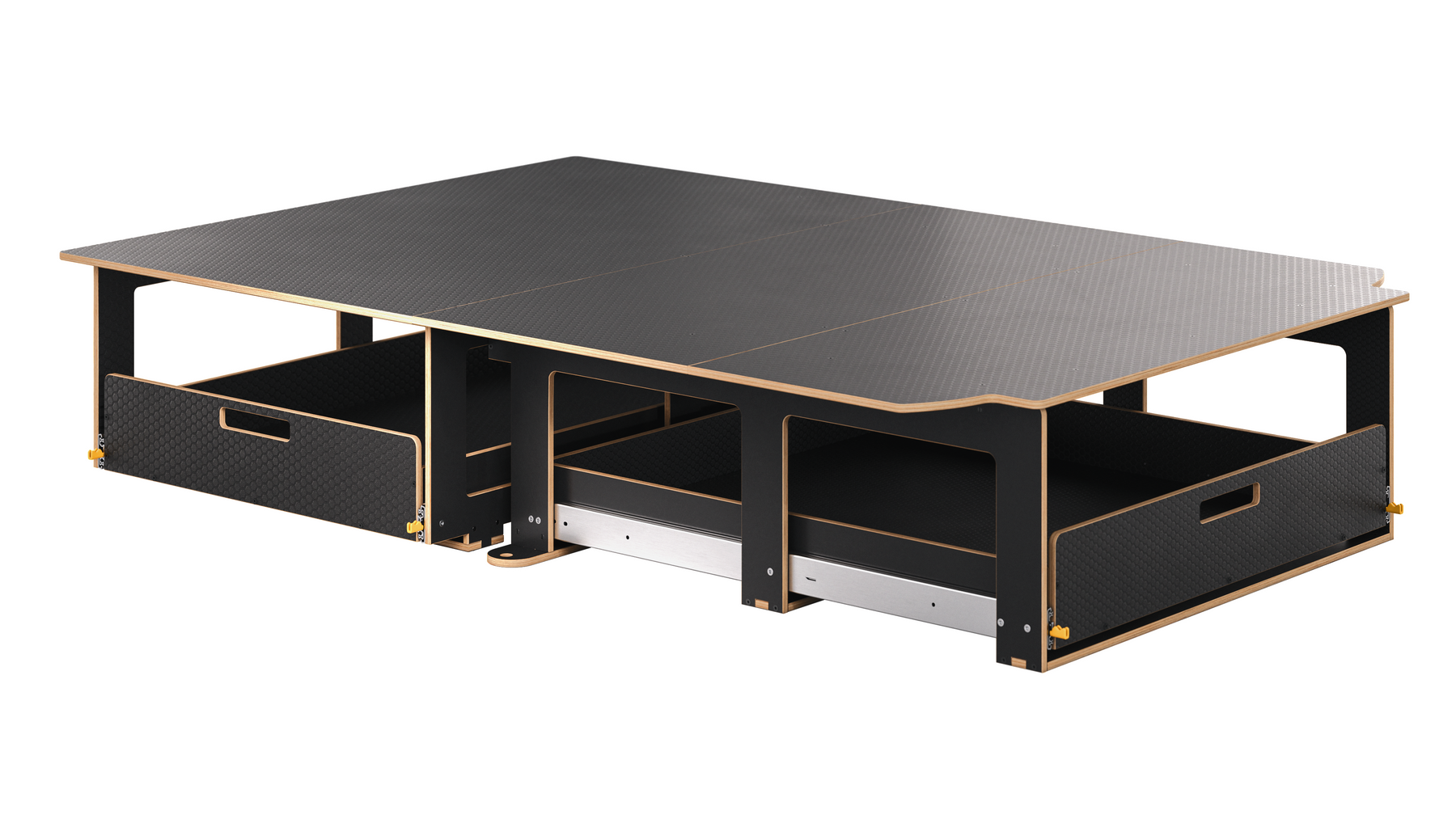 It combines both our single-drawer units, one behind the bulkhead and the other at the rear, creating a flat, continuous platform the full length of the van — ideal for carrying sheet materials, ladders, or bulky items on top.