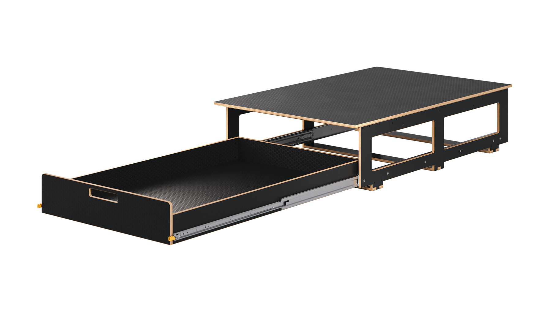 This unit fits behind the bulkhead, with a large smooth-sliding drawer that opens from the side loading door — keeping the back of your van free for larger gear.